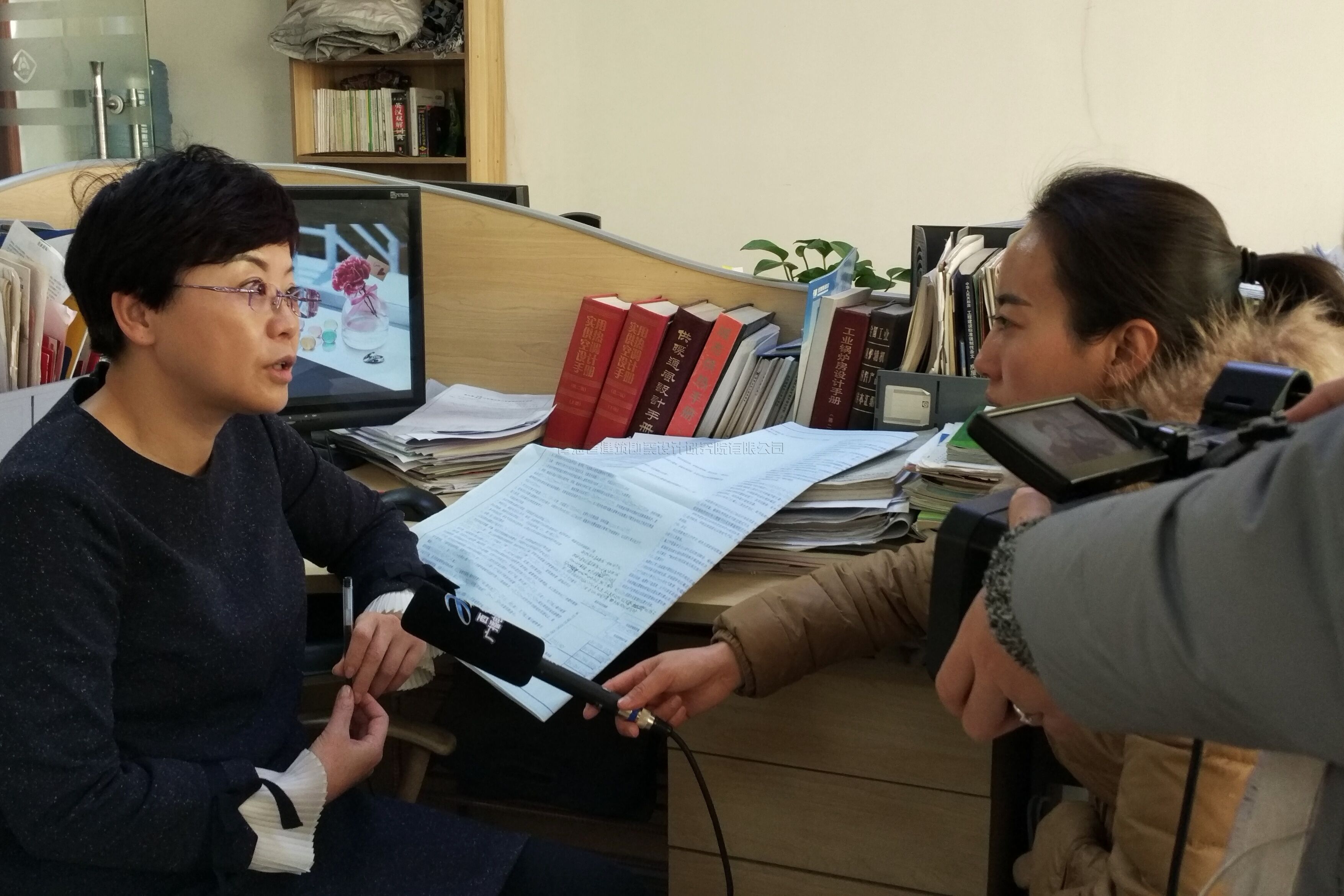 專訪結束后,記者錄拍了貴賓廳陳列的一些公司獲得了重要榮譽牌匾。接著,在公司工作人員的引導下,到各設計所了解一線人員的工作情況,并對設計二所技術人員王麗華高級工程師進行了簡短采訪,王麗華同志從電氣設計角度談了“誠信是社會效益的重要組成部分,只有以甲方的合理需求為出發點,嚴格按設計規范誠信設計,才能求得企業的長遠發展”。記者隨后又來到設計四所,公司監事會主席、四所所長于俊江和所設計人員正在討論一些設計問題,記者拍攝了一些他們一起忙碌的工作畫面。